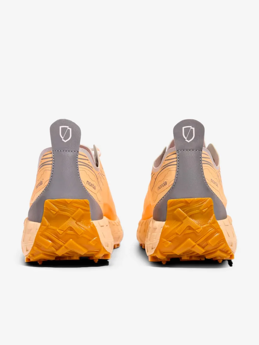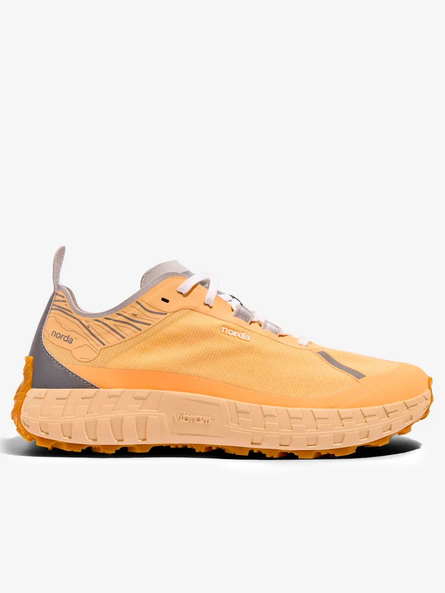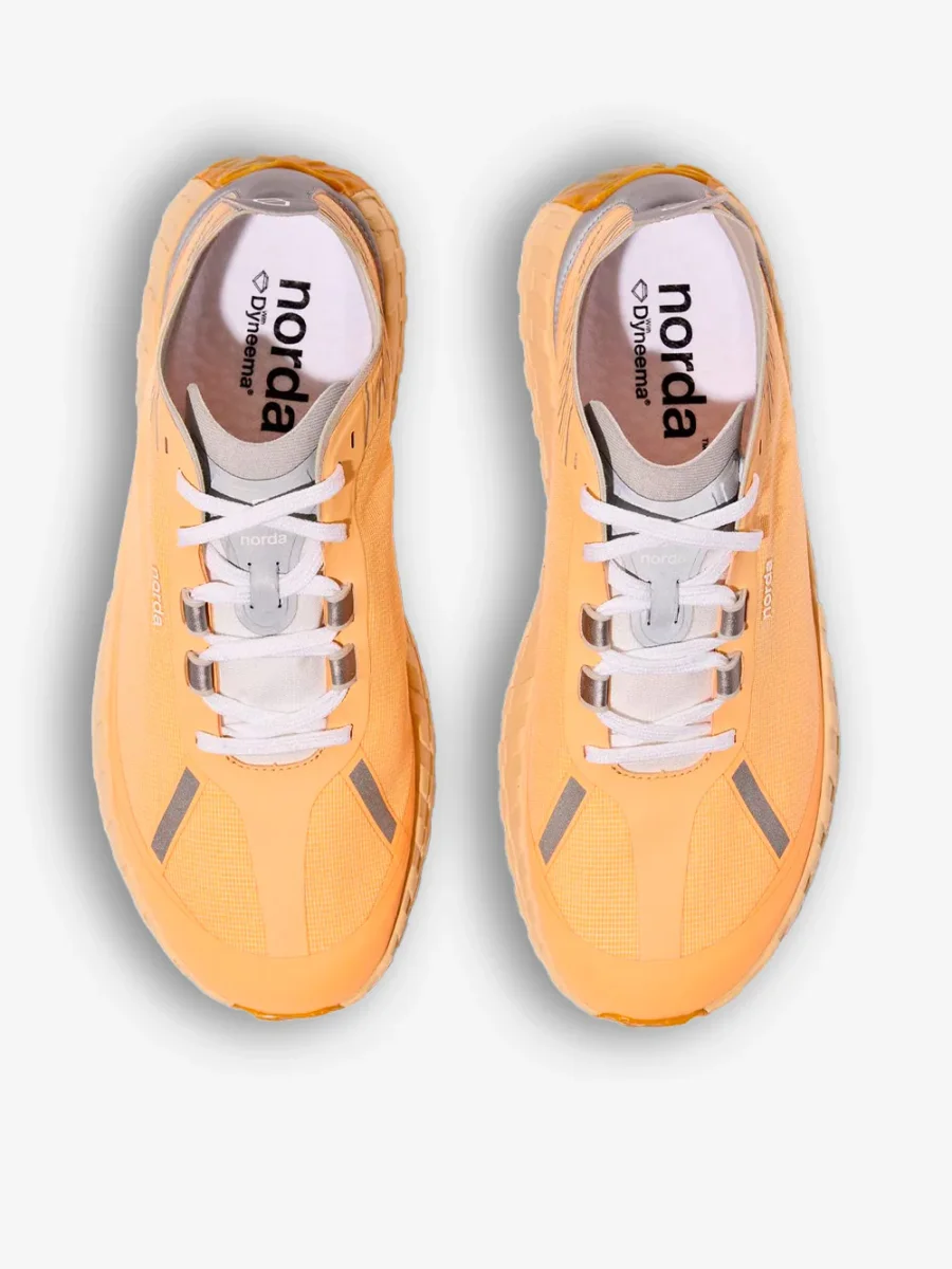 Le Norda 001, qui nella colorazione arancione Rhodotus, sono le sneakers da trail dalla tecnologia avanzata e dal design sperimentale. Realizzata con la prima tomaia Bio-Dyneema® senza cuciture al mondo e l’esclusiva intersuola e suola Vibram, la 001 è progettata con i materiali più leggeri e resistenti per un comfort spensierato durante le attività consapevoli.