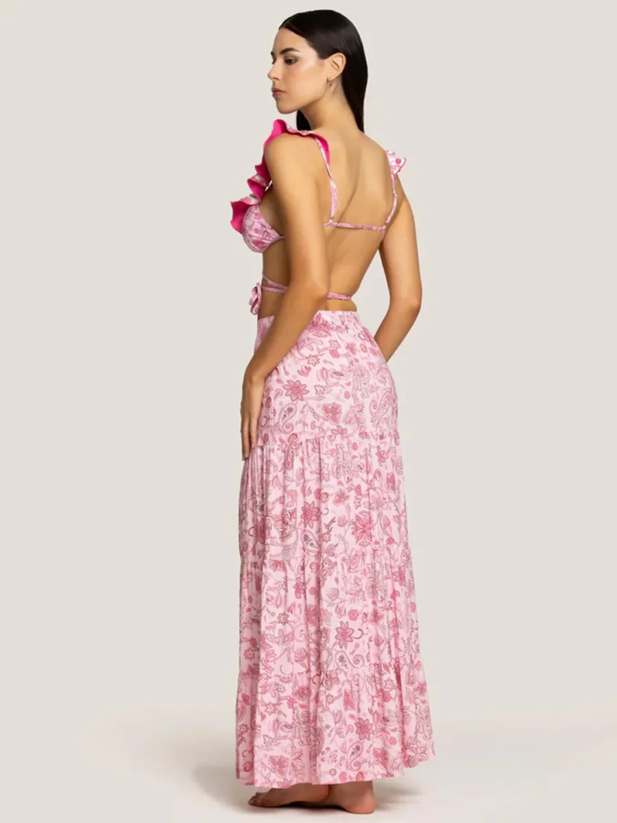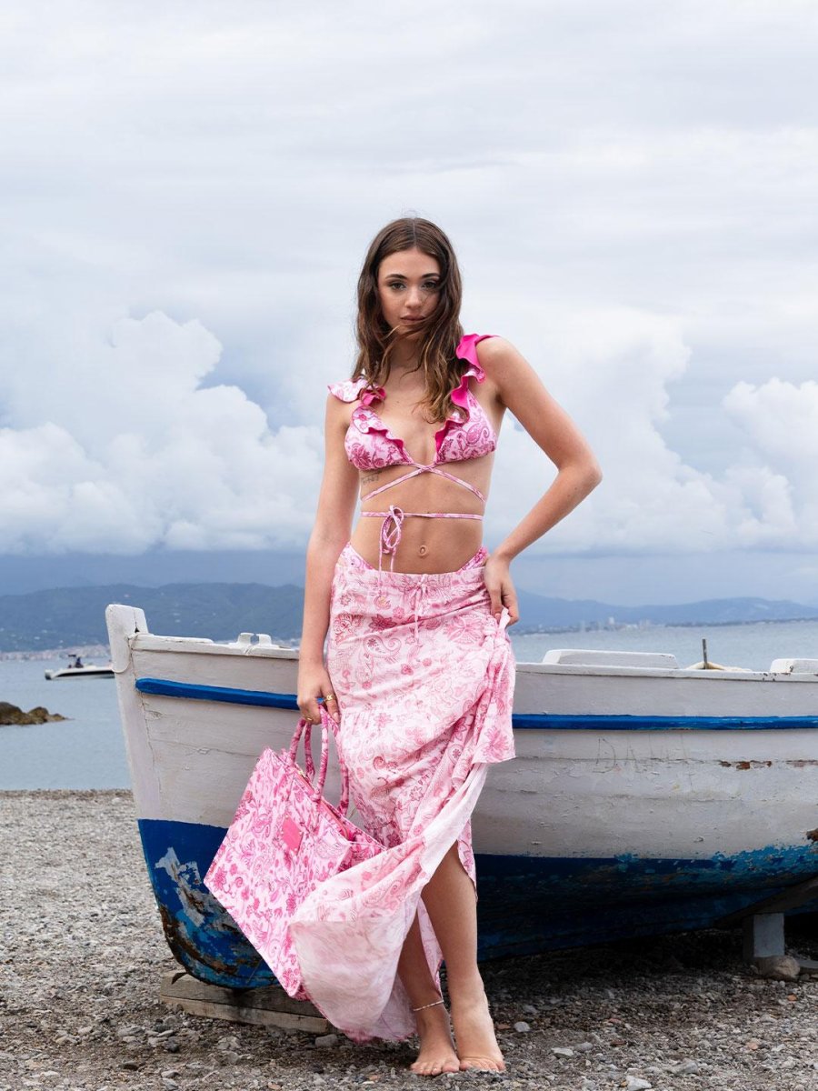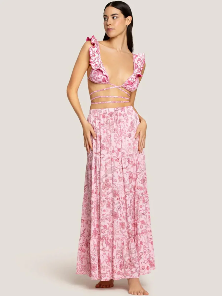 Parte di un setGonna rosa in mussolaVita alta elasticizzataLunghezza lunga Fantasia bandana su tutto il tessuto Materiali:Materiale: 100% viscosa