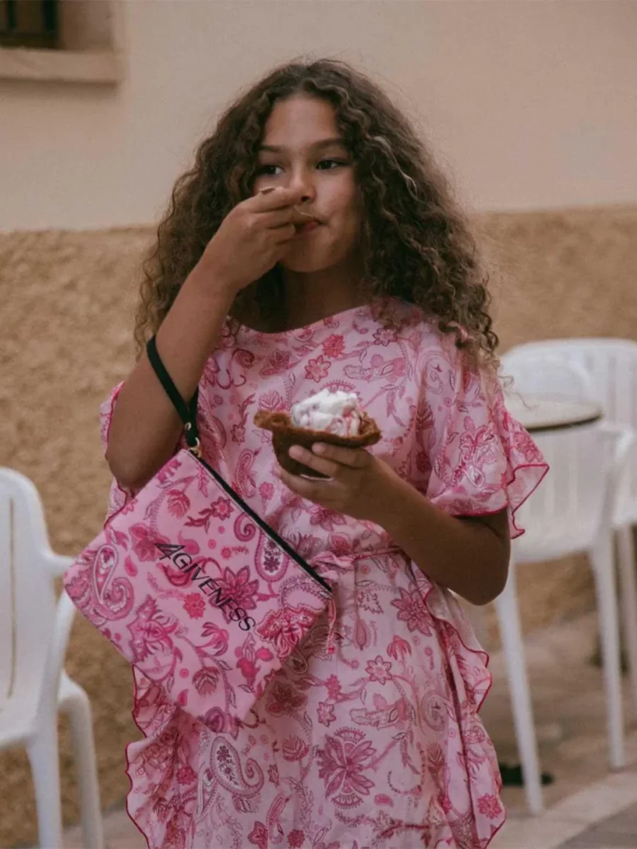 Parte di un setKaftano rosa Scollo rotondo Mezza manica Citnura in vita Orli con volant Fantasia Antibes Vestibilitร regolare