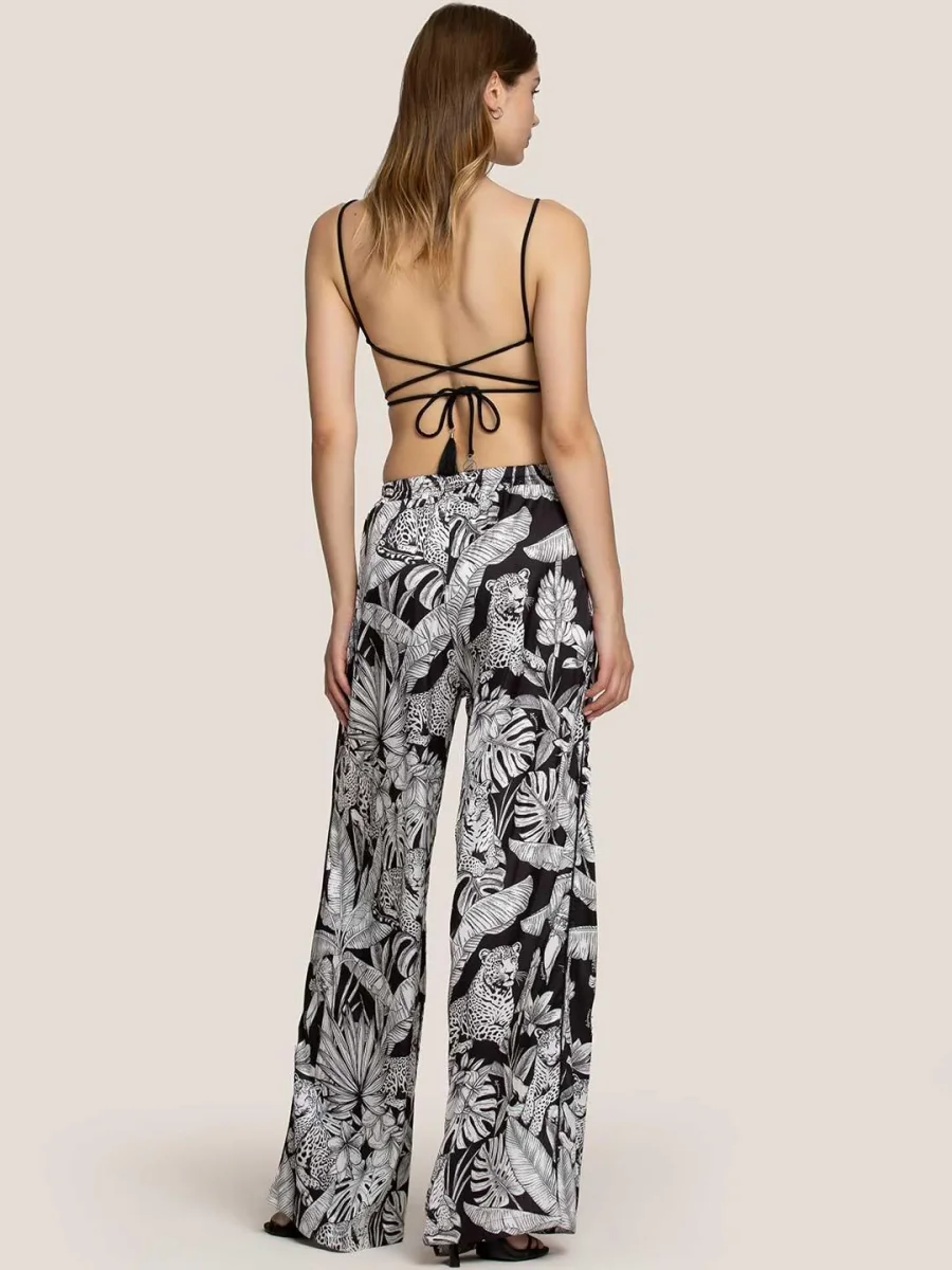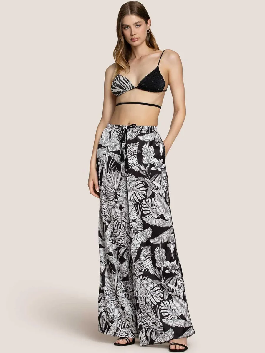 Parte di un setPantalone nero Vita elasticuizzata con coulisse Tasche sul davanti Fantasia su tutto il tessuto Composizione: 96,5% poliammide, 3,5% elastan