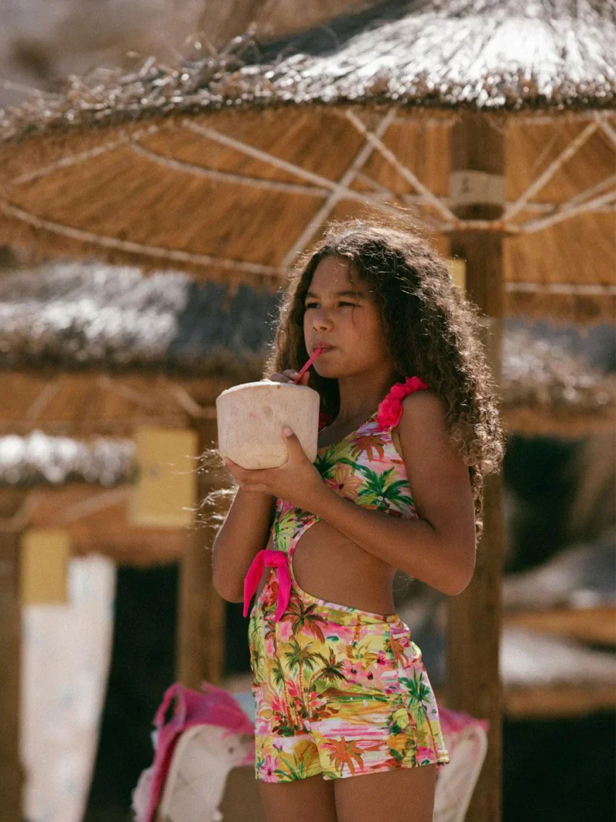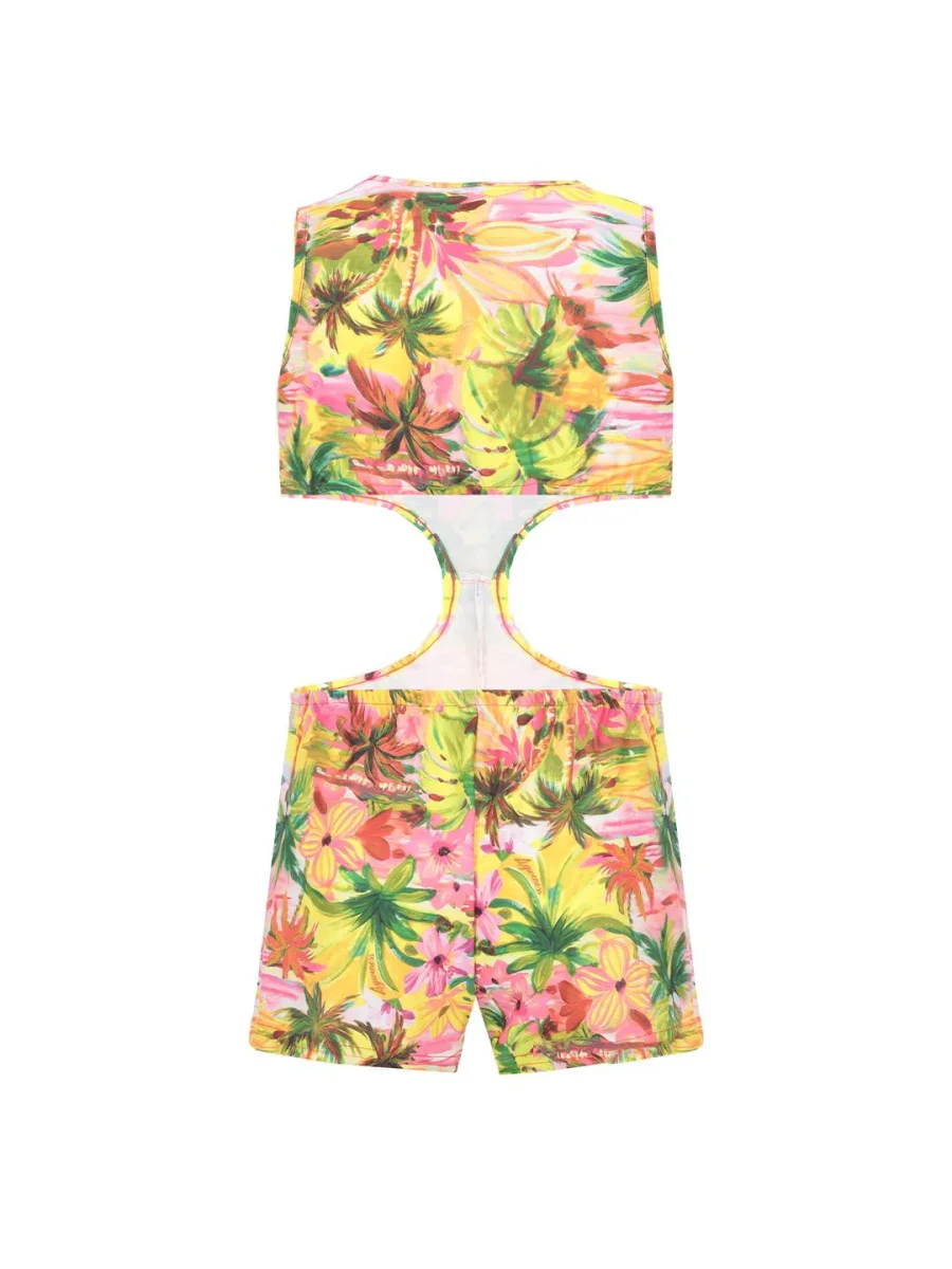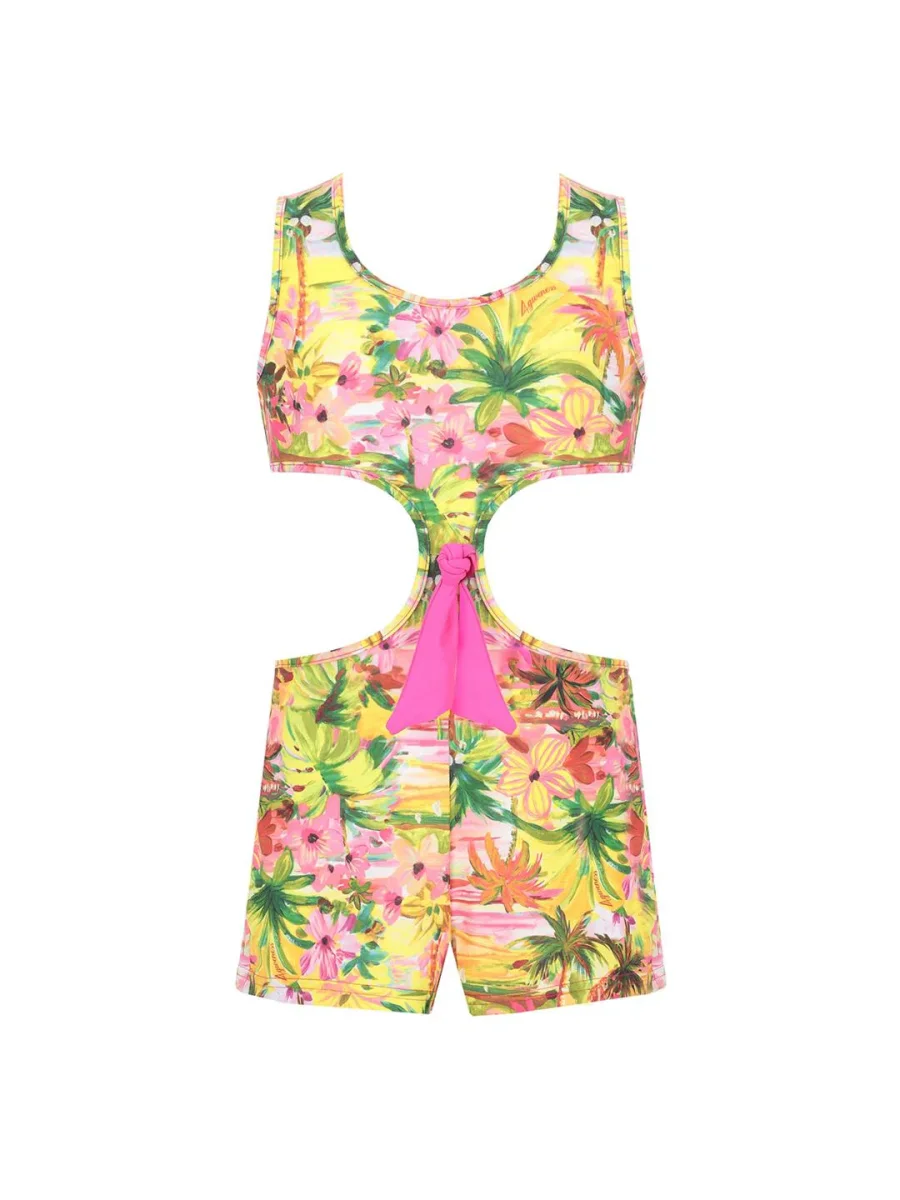Parte di un setTuta a fantasia Beretelle larghe fisse con volant GirocolloScollo sul retro Effetto cut-out sul davanti Applicazione nodino sul davanti Vita elasticizzata Fantasia Eden SoulVestibilità regolare Composizione: Esterno: 82% poliammide, 18% elastanInterno: 88% poliammide, 12% elastan