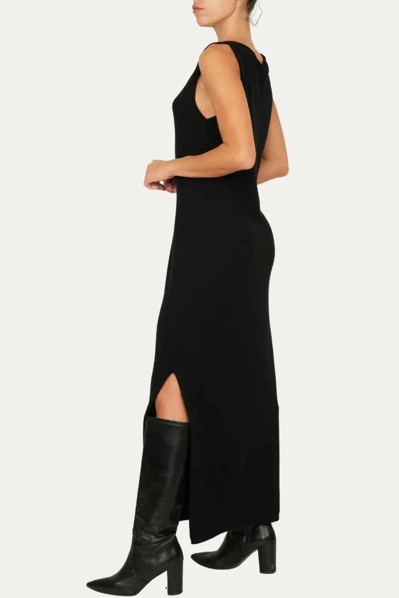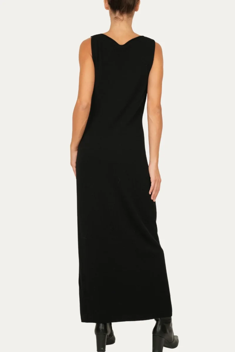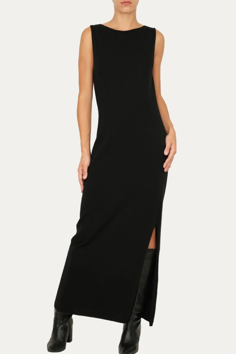 Variante nero, elegante e senza tempo, questo abito lungo senza maniche esprime una femminilitร discreta e contemporanea. Lo scollo rotondo pulito mette in risalto il collo e le spalle, mentre lo spacco frontale dona slancio e sensualitร senza eccessi. Una linea minimal, perfetta per look versatili che accompagnano la giornata con stile, ma anche un’occasione piรน speciale.
