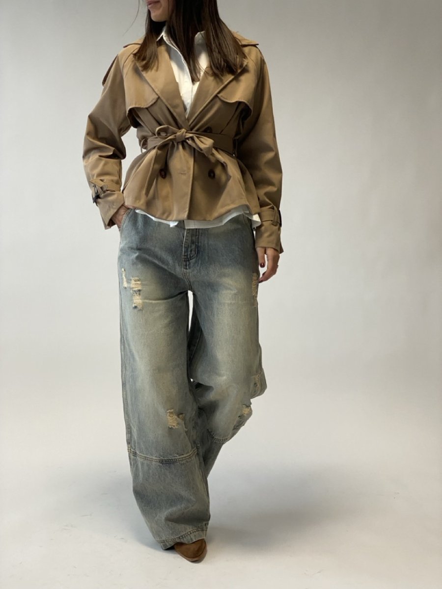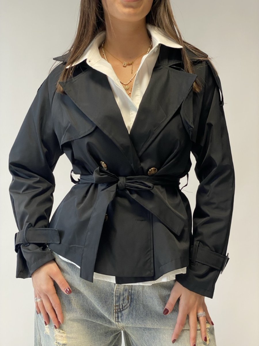 Trench corto modello doppiopetto con tasche laterali e cintura in vita.