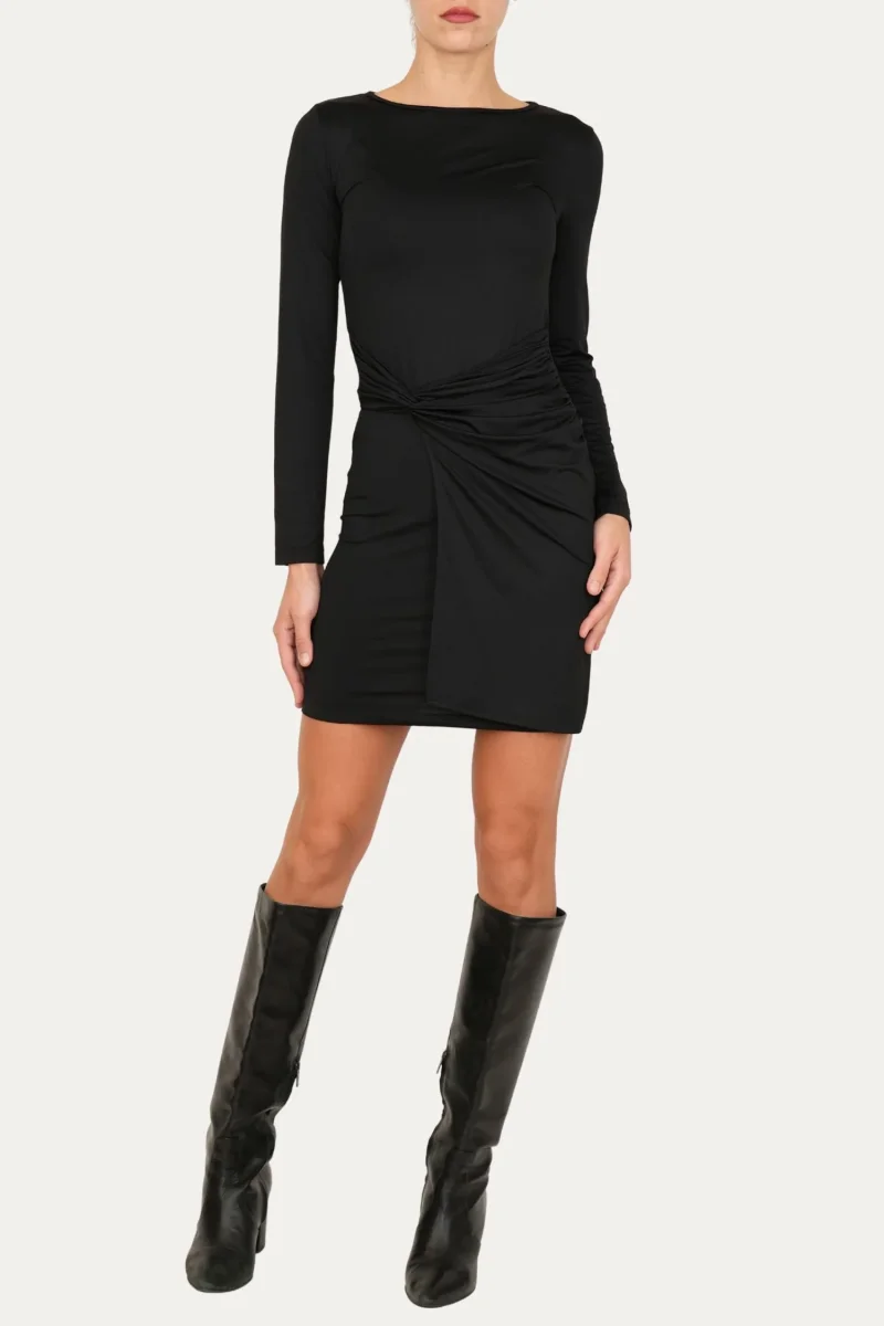 In una tonalitร nera profonda e senza tempo, questo tubino esprime eleganza e carattere. Con la sua linea e il dettaglio intrecciato sul punto vita scolpisce delicatamente la silhouette. Il tessuto morbido ed elasticizzato valorizza le curve senza costringerle, creando un effetto slanciato e sinuoso. Lo scollo girocollo e le maniche lunghe lo rendono un capo versatile, femminile, sofisticato e sicuro di sรฉ.