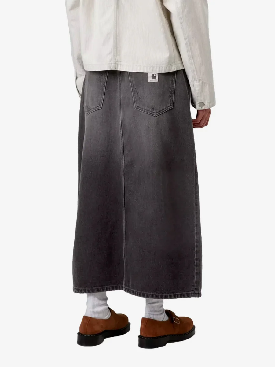 Basata su un modello jeans a cinque tasche, la gonna presenta sprone posteriore e spacco sul davanti. Ulteriori elementi funzionali sono l’impuntura a travetta e i rivetti in metallo nei punti di maggior usura. Il design è impreziosito da un’etichetta quadrata in tessuto.